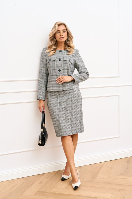 Комплект юбочный 2-х предметный, состоящий из жакета прямого силуэта на подкладке и классической юбки длинной ниже колена на подкладке. Жакет с круглой горловиной и центральной застёжкой на петли и декоративные пуговицы. По полочке обработана нагрудная вытачка, в области груди настрочен клапан, закрепленный пуговицей. Спинка цельнокроеная. Рукав втачной, длинный. Юбка полуприлегающего силуэта, длиной до середины колена. В среднем шве заднего полотнища юбки обработана потайная молния, по низу шлица.