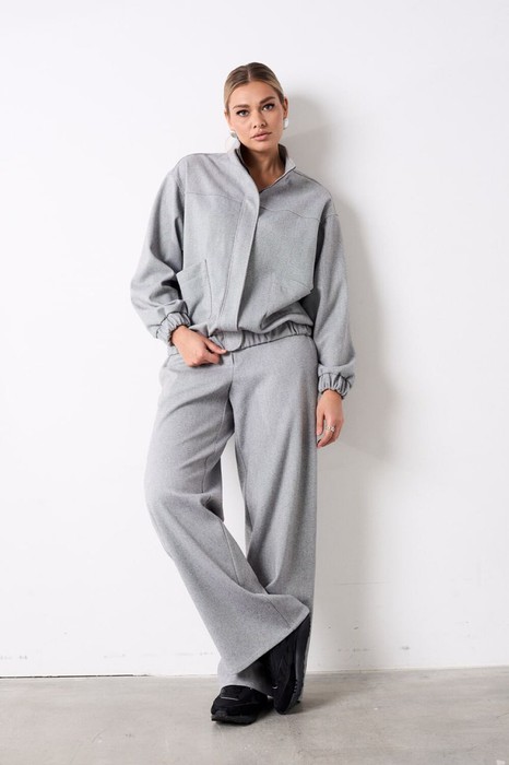 Костюм из трикотажной ткани, состоящий из джемпера и брюк. Джемпер прямого силуэта, по полочке обработана кокетка и в области талии накладные карманы с асимметричным краем, застежка центральная на тесьму молнию закрытая ветрозащитной планкой фиксирующаяся кнопками. Воротник стойка. Низ изделия на притачном поясе с эластичной тесьмой. Линия плеча слегка спущена, рукав втачной по низу притачная манжета с эластичной тесьмой. Брюки прямого силуэта, в боковых швах обработаны карманы. Верхний срез обработан притачным поясом по задним половинкам для лучшей посадки вставлена резинка, застегивающийся на петлю и пуговицу, застёжка центральна с гульфиком и откоском на тесьму