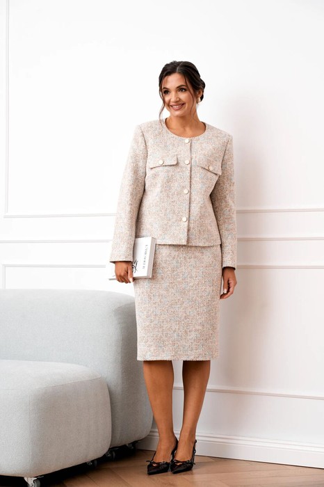Комплект юбочный 2-х предметный, состоящий из жакета прямого силуэта на подкладке и классической юбки длинной ниже колена на подкладке. Жакет с круглой горловиной и центральной застёжкой на петли и декоративные пуговицы. По полочке обработана нагрудная вытачка, в области груди настрочен клапан, закрепленный пуговицей. Спинка цельнокроеная. Рукав втачной, длинный. Юбка полуприлегающего силуэта, длиной до середины колена. В среднем шве заднего полотнища юбки обработана потайная молния, по низу шлица.