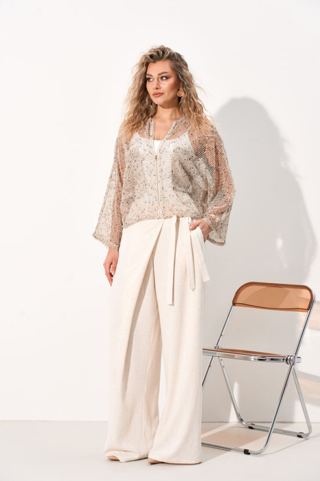 Комплект женский состоящий из бомбера и брюк. Брюки выполнены из смесового волокна льна и вискозы благодаря чему отлично садятся по фигуре и обеспечивают износостойкость. Крой брюк прямого с элегантным запахом по передним половинкам, в боковых швах обработан карман с отрезным бочком, в среднем шве застёжка на тесьму-молнию. Верхний срез обработан поясом кокеткой, застёгивающийся на потайные пуговицы и фиксирующийся завязками из ткани.
