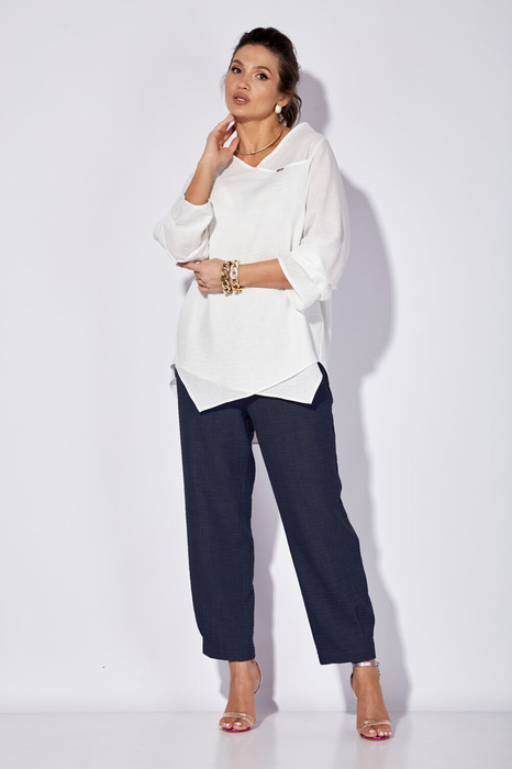 Комплект женский 2-хпредметный (блузка и брюки). Блузка женская из текстильной ткани.  Модель прямого силуэта, рукав углублённый , рубашечного типа. Перед идет с запахом, низ блузы ассиметричный, по полочке углы, спинка закруглённая, удлинённая. По рукаву идут защипы.В качестве декора-логотип фирмы на горловине. Брюки из текстильной ткани, прямые, зауженные к низу за счет защипов. Пояс на резинке, по бокам карманы. Длина по спинке: 80см. Длина рукава: 47см. Длина брюк (48-52) -93см, (54-58)-95см