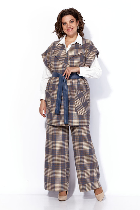 Бренд белорусской женской одежды больших размеров Anastasia представляет комплект двойку. Костюм женский 2-х предметный (жилет, брюки) станет отличным дополнением к Вашему гардеробу. Подойдет для повседневной носки (работа, офис, прогулки). Достаточно дополнить его соответствующими предметами из вашего гардероба: блузка, майка, водолазка, гольф, свитер, лонгслив, свитшот. Жилет женский из текстильной ткани в клетку без подкладки. Модель прямого силуэта с закпахом, со съемным поясом из эко кожи. По полочке идут накладные карманы. Брюки прямые, пояс на резинке, по бокам карманы. Благодаря своему крою и фасону костюм подчеркивает женственные формы и скрывает то, что должно быть незаметным. Это повседневный вариант на каждый день для занятий в школе или для офиса, на работу или на прогулку. Наденьте его на деловую встречу, официальное мероприятие, школьное торжество. Модель подойдёт для образа в университет или колледж. Этот предмет одежды подчеркнет вашу элегантность и сделает образ более женственным. Одежда для женщин больших размеров и не только, по отличным ценам и высокого качества - это Anastasia! Добавляете нас в любимые бренды и вы всегда будете в курсе всех акций и новинок! Новинка осень 2024! Хороших покупок от «Анастасия». Длина по спинке: (50-58)-90см. Длина брюк (50-54) -100см, (56-58)-103см