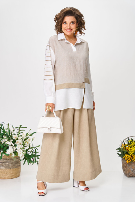 Комплект создан для тех, кто ценит комфорт и элегантность в каждой детали. В комплект входит блузка и штаны палаццо. Оверсайз крой придаёт костюму особый шарм, а легкая невесомая ткань дает свободу движений. Высокая посадка и резинка по поясу подчёркивает талию и делает силуэт более изящным. Смесь натуральных материалов позволяет пропускать воздух и отводить влагу, что особенно важно в жаркую погоду и прохладное утро. Ткань не мнется.   Благодаря свободному крою костюм подойдёт для разных типов фигуры. Он подчеркнёт вашу индивидуальность и станет отличным дополнением к вашему летнему гардеробу. Этот брючный костюм — не просто одежда, это заявление о вашем стиле и вкусе. В нём вы будете чувствовать себя уверенно и комфортно, зная, что выглядите на все сто. Выбирая этот костюм, вы выбираете качество, комфорт и стиль. Выберите льняной костюм и наслаждайтесь летом в полной мере!Блузка прямого силуэта, застежка на планку и пуговицы. Воротник на отрезной стойке. По полочке идет ассиметричный подрез со вставками из 2-х видов однотона и разрезом. Плечо спущенное, рукав длинный со вставками из ткани в полоску, на манжете. По спинке идет кокетка из ткани в полоску и встречная складка. Брюки полаццо прямые с односторонней складкой и запахом по центру. По низу брюк широкая подгибка.Пояс на резинке . В качестве декора- брендированная металлическая нашивка по подрезу полочки.  Длина по спинке (50-54) - 74 см, (56-60) - 76 см. Длина рукава (с манжетой): (50-54) - 57 см, (56-60)-59см. Длина брюк: (50-54) - 98 см, (56-60) - 99 см