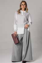 Комплект из костюмной ткани создан для тех, кто ценит комфорт и элегантность в каждой детали. В комплект входит блузка и штаны палаццо. Оверсайз крой придаёт костюму особый шарм и дает свободу движений. Высокая посадка и резинка по поясу подчёркивает талию и делает силуэт более изящным.  Благодаря свободному крою костюм подойдёт для разных типов фигуры. Он подчеркнёт вашу индивидупльность. Блузка прямого силуэта, застежка на планку и пуговицы. Воротник на отрезной стойке. По полочке идет ассиметричный подрез со вставками из 2-х видов однотона и разрезом. Плечо спущенное, рукав длинный со вставками,  на манжете. По спинке идет кокетка и встречная складка. Брюки полаццо , прямые с односторонней складкой и запахом по центру. По низу брюк широкая подгибка. Пояс на резинке . В качестве декора- брендированная металлическая нашивка по подрезу полочки.  Длина по спинке (50-54) - 74 см, (56-60) - 76 см. Длина рукава (с манжетой): (50-54) - 57 см, (56-60)-59см. Длина брюк: (50-54) - 97 см, (56-60) - 98см
