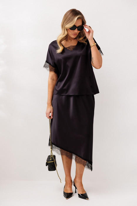 Женский элегантный  костюм от Anastasia, подходящий для нарядной и повседневной носки. Костюм женский 2-х предметный из атласной ткани с отделкой из деликатного кружева (блузка, юбка).  Ажурное кружево, деликатно украшающее низ юбки. горловину  и рукава блузки, добавляет образу романтичности и утонченности. Отлично подойдет на любой тип фигуры, подчеркнет вашу женственность.  Блузка  прямого  силуэта со спущенным плечом, V-образным вырезом и косым низом. Юбка, выкроеная по косой с асимметричным низом, создает женственный и изысканный силуэт. Пояс на резинке. Юбка с кружевом внизу  станет идеальным выбором для создания как повседневных, так и праздничных образов.   Длина блузки  (48-52)- 55см, (54-58)- 59см . Длина юбки с кружевом: длинная сторона (48-58)- 89 см. короткая сторона (48-58)-70см.