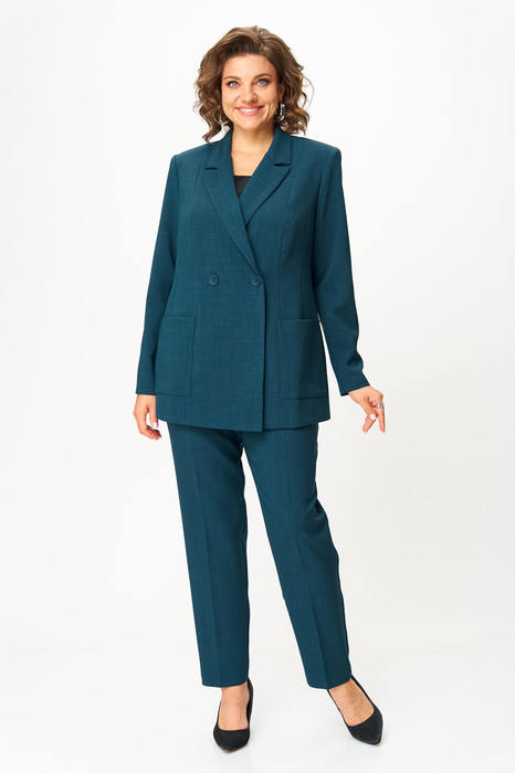 Костюм состоит из жакета и брюк. Костюм выполнен из однотонной ткани. Жакет прямого силуэта, НА ПОДКЛАДКЕ. Полочка жакета с вертикальными рельефами и двубортной застежкой на две пуговицы. Горловина V-образной формы. На нижней части полочки выполнены накладные карманы. Спинка со средним швом и отрезными бочками. Рукав длинный, втачной, двухшовный. Брюки со стрелками, зауженные к низу. По передним половинкам выполнены наклонные карманы и складки по талии. По задним половинкам обработаны талиевые вытачки. В среднем шве передней половинки брюк обработана застежка на молнию. Брюки на притачном поясе с эластичной тесьмой и застежкой на петлю и пуговицу.