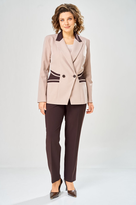 Полочка жакета с двубортной застежкой на петли и пуговицы, с вертикальными рельефами и декоративным элементом на бочках полочки. Горловина V-образной формы, с отложными лацканами и воротником пиджачного типа. Спинка со средним швом и вертикальными рельефами. Рукав длинный, двухшовный, втачной.