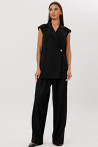 Костюм женский тройка, на любые мероприятия, состоящий из жакета ,брюк и топа. модный соременный. Жакет с воротником пижачного пита, с центральной бортовой застёжкой на 3 петли и 3 пуговицы, полочка с нагрудной вытачкой, с рарзезами по бокам. жакет со сьёмным поясом. Спинка цельная. Брюки женские прямого кроя, на притачном поясе с резинкой.. Передние половинки с карманами в швах. Топ прямого силуэта с нагрудными вытачками и с разрезами по боковым швам. Блузка-топ с регулирующей длину бретелек фурнитурой.
