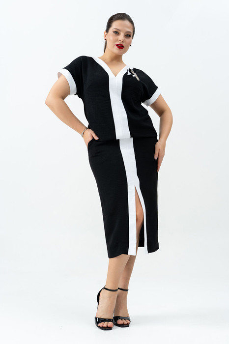 Костюм женский юбочный. Блуза с V-образным вырезом горловины, с декором по полочке, со спущенными рукавами, полочка с нагрудными вытачками, низ блузки на резинке. Юбка с резинкой по спинке и боковым швам пояса. с боковыми наклонными карманами. юбка со вставками по переду.