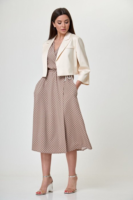Костюм, состоящий из платья и жакета-болеро. Платье на запах, длина ниже колен. Пройма и горловина обработаны обтачками. По линии талии кулиска, в которую протянут шнурок, для фиксации платья. Так же для этого можно использовать узкий пояс.