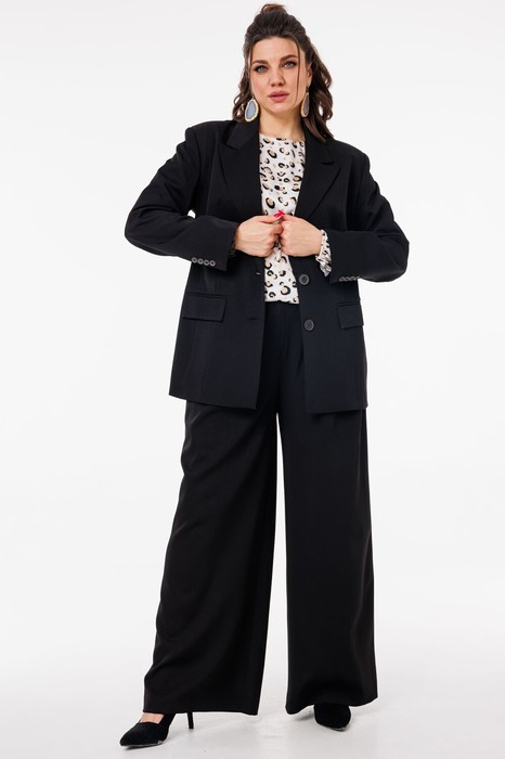 Жакет с архитектурным кроем, принтованной подкладкой и функциональными деталями, такими как карманы с клапаном, добавляет ему изысканности и практичности. Брюки-палаццо с высокой посадкой, мягкими складками и боковыми карманами создают элегантный и комфортный силуэт, который подчеркивает фигуру и подходит для разных сезонов.