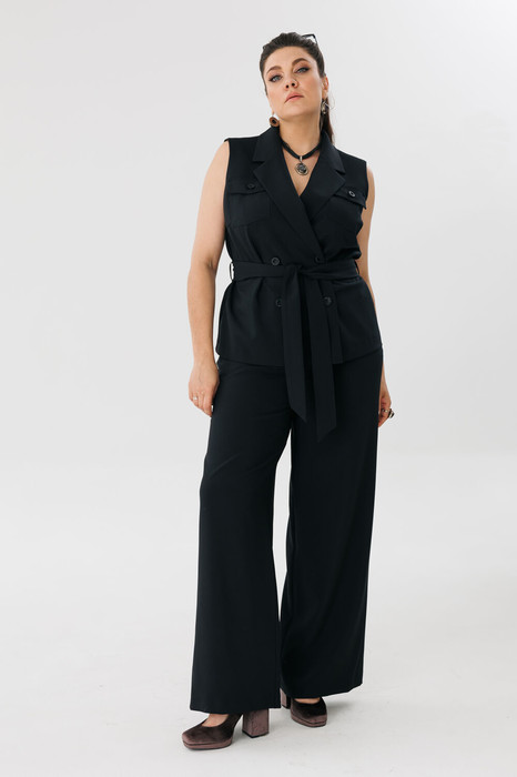 Жилет с ремнём, выполненный из той же ткани, добавляет образу завершённость и строгую изысканность. Карманы на жилете не только функциональны, но и придают особый шарм. Жилет можно носить как на рубашку для создания классического делового образа, так и без неё, что делает костюм идеальным вариантом для вечерних мероприятий.