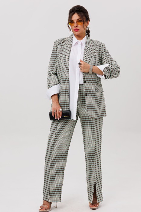 Жакет безупречного кроя, на удобной подкладке, мягко облегает фигуру, создавая собранный и стильный образ. Брюки с эффектными разрезами внизу добавляют динамики и лёгкости каждому шагу, делая силуэт одновременно строгим и необычным.