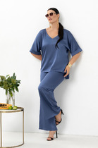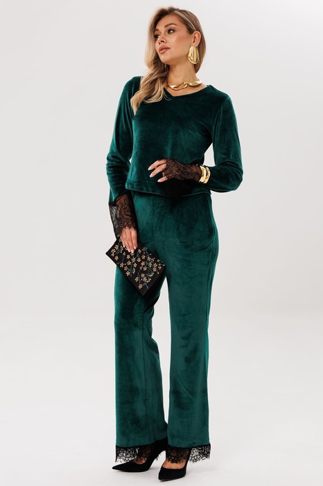 Брюки костюма отличаются продуманным кроем и максимальным комфортом благодаря эластичной резинке на поясе, которая обеспечивает идеальную посадку на любой фигуре. Практичные карманы, искусно вшитые в боковые швы добавляют функциональности модели. Силуэт брюк элегантно расширяется к низу, а завершающий кружевной декор создает единую стилистическую композицию с джемпером, подчеркивая изысканность всего образа.