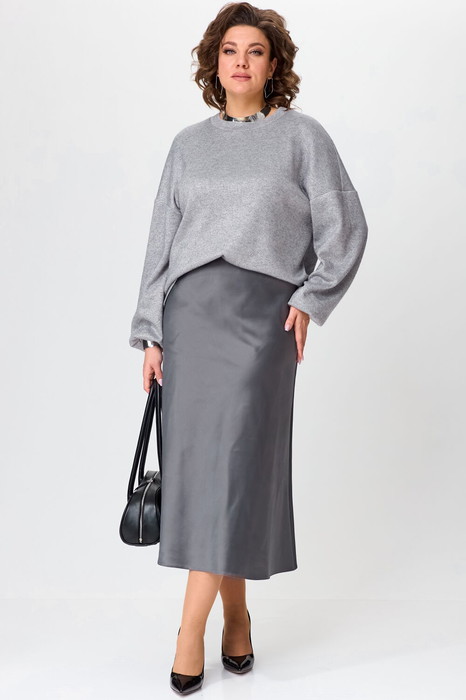 Модный женский комплект из атласной юбки и свободного джемпера с люрексом — это стильное и комфортное решение для создания как повседневных, так и вечерних образов.