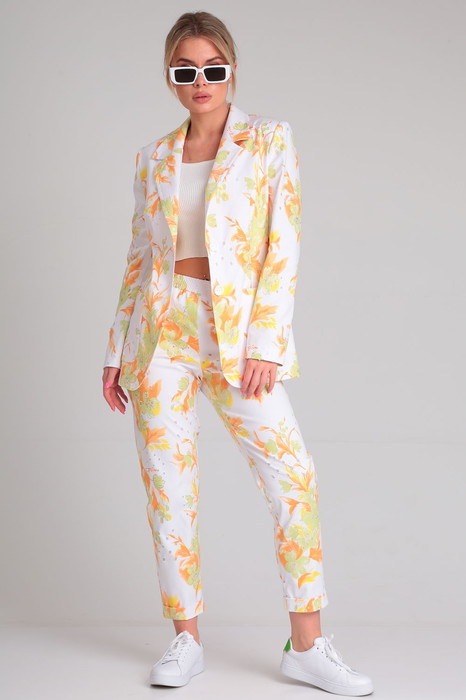 Яркий и эффектный двухпредметный женский комплект состоит из классического жакета и удобных брюк. Комплект выполнен из принтованной хлопковой ткани, которая не сковывает движения и идеальна для теплой погоды.