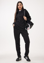 Брюки с высокой посадкой, слегка зауженные книзу, с поясом на резинке. В боковых швах имеются функциональные наклонные карманы. По низу брючин - манжет.