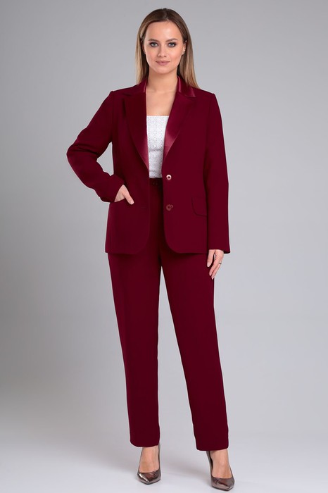 Однобортный жакет полуприталенного силуэта, на подкладке, с плечевыми накладками. Воротник пиджачного типа с отложными лацканами. По переду центральная застежка на петли и пуговицы и прорезные карманы с клапаном, талиевые вытачки и рельефы. Низ бортов закругленной формы. Спинка со средним швом и рельефами. Рукав втачной двухшовный длинный.