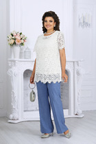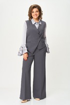 Брюки с высокой посадкой, слегка заужены книзу. Притачной пояс со шлевками и застежкой на молнию и пуговицу, по боковым - вставка из эластичной тесьмы. На задних половинках - вытачки. В боковых швах расположены функциональные косые карманы.