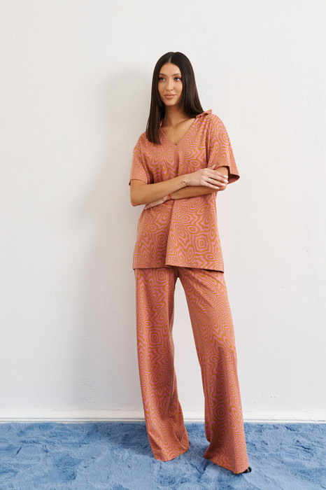 Комплект состоит из джемпера и брюк выполнен из трикотажного полотна с абстрактным принтом. Характеристики джемпер прямого свободного кроя, V образный плавный вырез горловины, отложной воротник, рукав втачной слегка спущен. Длина 71 см, длина рукава от края горловины 37 см. Брюки прямого свободного кроя, пояс брюк на резинке. Длина изделия 111 см.