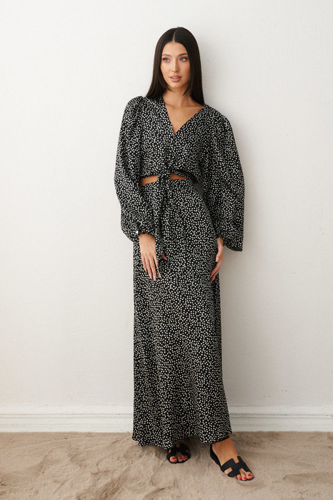 Комплект состоит из укороченной рубашки и юбки выполнен из черной ткани с цветочным принтом. Характеристики: рубашка свободного кроя, V образный вырез горловины, по низу рубашки декоративные завязки выполнены из ткани основного изделия, рукав втачной свободного кроя, по низу рукава резинка, по низу спинки резинка. Длина по спинке 37 см, длина рукава 69 см. Юбка полуприлегающего силуэта, пояс стабильный, застёжка потайная тесьма молния в среднем шве заднего полотна изделия. Длина юбки 103 см.