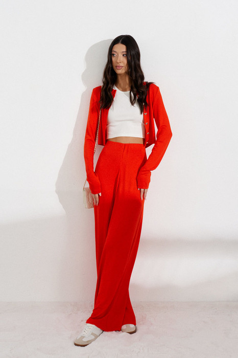 Комплект состоит из джемпера и брюк выполнен из трикотажного полотна оранжевого цвета. Характеристики: джемпер укороченный, V образный вырез горловины, застежка центральная на петли пуговички, пуговички выполнены в виде сердец, рукав втачной. Длина по спинке 42 см, длина рукава 70 см. Брюки прямого кроя , пояс брюк на резинке на подгибе. Длина 111 см.