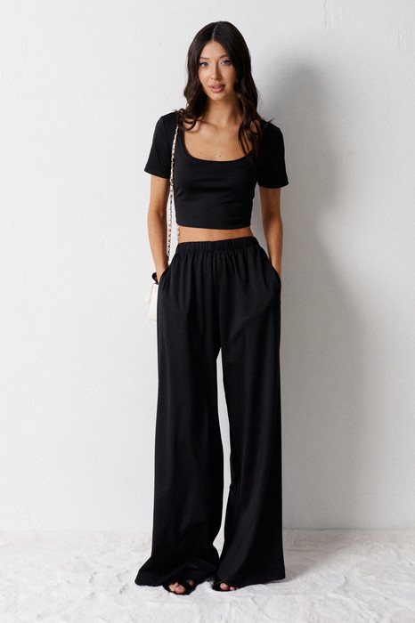 Комплект состоит из топа и брюк выполнен из черной эластичной ткани. Характеристики: укороченный топ, углубленная горловина, рукав короткий втачной. Длина по спинке 36 см, длина рукава 19 см. Брюки прямого кроя, пояс брюк на резинке, в боковых швах карманы. Длина брюк 107 см.