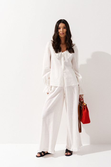 Комплект состоит из рубашки и брюк выполнен из льняного полотна. Характеристики: рубашка прямой свободный крой, V-образный плавный вырез горловины, отложной крупный воротник, воротник по перемитру украшен кружевом, застежка центральная на петли пуговицы, рукав втачной, по низу рукава, в обасти запясться резинка. Длина по спинке 60 см, длина рукава 69 см. Брюки прямого свободного кроя, пояс брюк на резинке со сборкой, в боковых швах карманы, по низу брюк нашита рюша выполнена из ткани основного изделия. Длина 102 см.