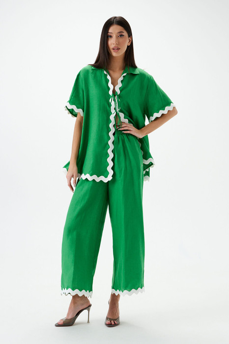 Комплект состоит из туники и брюк выполнен из зеленого полотна с контрастной тесьмой. Характеристики: туника прямой крой, на запах, отложной воротник, рукав втачной короткий, туника украшена широкой контрастной тесьмой. Длина по спинке 71 см, длина рукава 24 см. Брюки прямого кроя, на подкладке, пояс на резинке, по переду контрастная брендированная нашивка, в боковых швах карманы. Длина 96 см.