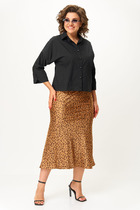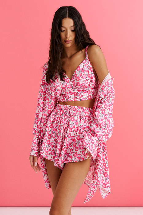 Комплект состоит из топа, рубашки и шорт выполнен из ткани с цветочным принтом. Характеристики: Рубашка прямой крой, отложной воротник, застежка центральная на петли пуговицы, по передней части изделия имитация карманов с клапанами, рукав спущен, в боковых швах разрезы. Длина по спинке 80 см, длина рукава от края горловины 78 см. Топ укороченный, фигурный вырез горловины, узкие бретели, по спинке резинка со сборкой, по переду под лифом стабильная вставка, застежки в изделии нет. Длина топа 28 см. Шорты свободного кроя, пояс на резинке со сборкой с кулиской, по бокам имитация запаха, низ изделия с планым срезом. Длина 32 см.