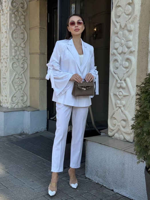 Костюм 2-хпредметный.  Жакет  однобортный свободнго силуэта. Жакет обработан подкладкой. Рукав прямой, длинный, втачной, отрезной с пришитой присборенной деталью, шнурком из основной ткани для завязывания.   Брюки прямого кроя, длинна 7/8, застёжка- гульфик , по боковым швам обработаны карманы