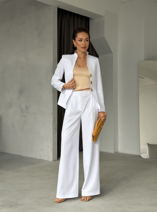 Этот 2-х предметный комплект состоит из жакета и брюк.                                                                                   Жакет. Нежный утонченный жакет выполнен из плотной костюмной ткани, обработан подкладкой. Приталенный крой мягко облегает фигуру, а изящные подплечники добавляют образу уверенности и грации, напоминая о классических образах французского кинематографа. Складки, создающие рельеф баски, мягко ложатся на бедра за счет своей геометрии. Рукава прямые втачные, одношовные.                                 Брюки.  Широкие брюки в классическом белом цвете сочетают в себе элегантность и удобство и станут эффектной деталью базового гардероба. Свободный крой не сковыает движений, а завышенная талия подчеркнут фигуру. Складки добавляют образу элегантность. Застёжка  на потайные  кнопки без лишнего визуального шума.