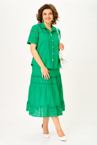 Комплект женский, состоящий из блузки и юбки, комбинированные из хлопковой однотонной ткани и ткани с вышивкой в тон.  Блузка прямого силуэта с рубашечным воротником и планкой с пуговицами, рукав короткий с манжетой по низу, по переду и спинке кокетки, низ изделия фигурный. Юбка расширенная к низу, на подкладке из х/б ткани однотонной, с воланами, по поясу эластичная тесьма.