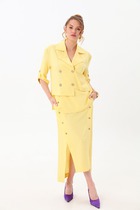 Комплект женский состоящий из блузки и юбки. Блузка прилегающего силуэта, отрезная по линии талии, вырез горловины-круглый, рукав 3/4 со складками по окату, застежка по спинке на пуговицы, изделие на подкладке, со съемным посом. Юбка прямая, зауженная к низу, на обтачке, застежка сзади на молнию, в среднем шве заднего полотнища-шлица, изделие на подкладке.
