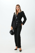 Длина изделия, размеры(42-48): жакет - 76 см, блузка - 43 см, брюки - 113 см; размеры(50-54): жакет - 77 см, блузка - 45 см, брюки - 114 см.