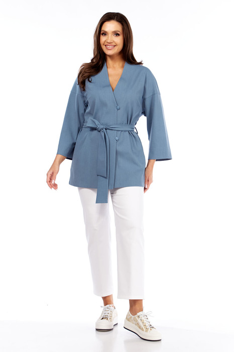 Компелект женский брючный, состоящий из жакета и брюк. Жакет в стиле "кимоно"  свободный, удлинённый  с 3/4 рукавом, с застёжкой спереди на пуговицы, со съёмным поясом из той же ткани. Брюки прямые на поясе-кокеткес эластичной тесьмой по спинке, с карманами. Длина брюк 7/8.