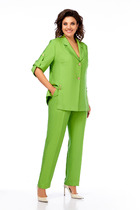 Женский нарядный двухпредметный костюм состоит из блузы и брюк с имитацией юбки спереди,выполнен из плательно-костюмной однотонной ткани с блестящим напылением.