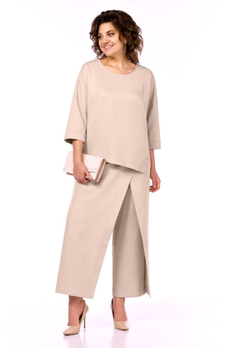 Женский нарядный двухпредметный костюм состоит из блузы и брюк с имитацией юбки спереди,выполнен из плательно-костюмной однотонной ткани с блестящим напылением.