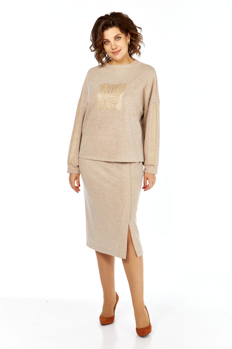 Женский трикотажный костюм состоит из джемпера с оригинальной вышивкой- аппликацией на коже и юбки, выполнен из трикотажного полотна "вельвет".