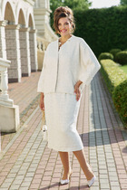 Туника прямого силуэта с цельнокроеной стойкой и ассисетричным низом.По центру переда и передних полотнищах брюк выполнены канты.Плечи слегка спущены.Рукава одношовные длинные.По низу декоративная металлическая пластинка.