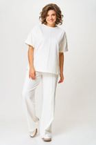 Костюм женский из трикотажного полотна «кулирка» с набивным рисунком, состоящий Футболка – из полотна с набивным рисунком, свободного покроя, с короткими втачными рукавами, горловиной овальной формы, окантованной основным материалом. На полочке выполнена вышивка.Шорты - из полотна с набивным рисунком, свободные, с карманами в боковых швах, на притачном поясе с эластичной тесьмой внутри. Детали передних половин разрезаны по косой, в шве соединения кант контрастного цвета.