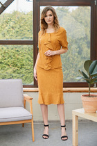 Комплект 2-х предметный состоит из жакета и и брюк. Жакет женский удлиненный, полуприлегающего силуэта с центральной бортовой застежкой на пуговицы до линии перегиба лацкана. Спереди рельефные швы от плечевого шва,отрезной бочок и карман с клапаном. Спинка с рельефами от плечевого шва. Рукав втачной, двухшовный. Воротник пиджачного типа. Перед жакета на подкладке. Длина рукава 62 см, длина жакета по спинке 70 см. Классические брюки, прямые, слегка заужены к низу, заутюжены стрелки,по переду обработаны карманы с отрезным бочком,застежка на тесьму-молнию и 1 пуговицу.На задних половинках обработаны вытачки и имитация карманов в рамку с двумя обтачками,пояс в брюках притачной. По низу брюк в боковом шве есть небольшой разрез. Длина брюк от талии по боковому шву 94 см.