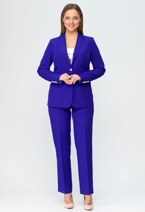 Комплект женский, 2-х предметный, состоит из жакета и и брюк. Жакет женский удлиненный, из текстильной ткани, на подкладке, полуприлегающего силуэта с центральной бортовой застежкой на пуговицы до линии перегиба лацкана. Спереди рельефные швы от плечевого шва, отрезной бочок и карман с клапаном. Спинка с рельефами от плечевого шва. Рукав втачной, двухшовный, по низу рукава обработана шлица на петли-пуговицы. Воротник пиджачного типа. Длина по спинке 66 см, длина рукава 62 см.Брюки прямые,классические, с заутюженными стрелками,по переду обработаны карманы с отрезным бочком,застежка на тесьму-молнию и 1 пуговицу.На задних половинках обработаны вытачки и имитация карманов с листочкой, пояс в брюках притачной. Длина брюк от талии по боковому шву 100 см.