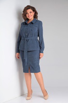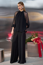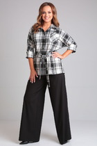 Комплект 2-х предметный состоит из блузы и и брюк. Блуза женская, прямого силуэта из текстильной ткани. Воротник отложной, застежка центральная на петли-пуговицы. По переду нагрудные вытачки и настрочены накладные карманы. Спинка цельная. Рукав втачной, одношовный, 3/4, с притачной манжетой. В боковых швах по низу небольшие разрезы. Длина по спинке 74 см, длина рукава 45. Брюки классические,из текстильной ткани, прямые, слегка заужены к низу,заутюжены стрелки,по переду обработаны карманы с отрезным бочком,застежка на тесьму-молнию и 1 пуговицу.На задних половинках обработаны вытачки и имитация карманов с листочкой, пояс в брюках притачной. Длина брюк от талии по боковому шву 105 см.