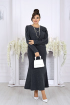 Комплект женский-двойка, из текстильной ткани, жакет удлиненный, полуприлегающего силуэта с центральной бортовой застежкой на пуговицы до линии перегиба лацкана. Спереди рельефные швы от плечевого шва, отрезной бочок и карман с клапаном. Спинка с рельефами от плечевого шва. Рукав втачной, двухшовный. Воротник пиджачного типа. Жакет на подкладке, длина по спинке 67 см, длина рукава 62 см. Брюки прямые, классические, с заутюженными стрелками, по переду обработаны карманы с отрезным бочком, застежка на тесьму-молнию и 1 пуговицу. На задних половинках обработаны вытачки и имитация карманов с листочкой, пояс в брюках притачной, по боковым швам резинка. Длина брюк от талии по боковому шву 103 см.