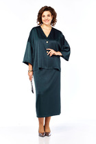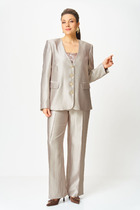 Комплект женский-двойка, из текстильной ткани, жакет удлиненный, полуприлегающего силуэта с центральной бортовой застежкой на пуговицы до линии перегиба лацкана. Спереди рельефные швы от плечевого шва, отрезной бочок и карман с клапаном. Спинка с рельефами от плечевого шва. Рукав втачной, двухшовный. Воротник пиджачного типа. Жакет на подкладке, длина по спинке 67 см, длина рукава 62 см. Брюки прямые, классические, с заутюженными стрелками, по переду обработаны карманы с отрезным бочком, застежка на тесьму-молнию и 1 пуговицу. На задних половинках обработаны вытачки и имитация карманов с листочкой, пояс в брюках притачной, по боковому на резинке.  Длина брюк от талии по боковому шву 103 см.