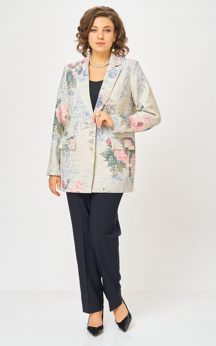 Этот двухпредметный комплект— основа безупречного гардероба.Жакет— воплощение уютной элегантности. Выполненный из фактурного твида, он сочетает в себе непринужденность свободного силуэта и безупречную классику кроя. Идеален для создания как повседневных, так и собранных образов. Воротник пиджачного типа, застежка до линии лацкана и изящные прорезные карманы с клапанами делают образ законченным и утонченным, жакет полностью на подкладке. Длина по спинке 75 см, длина рукава 63 см. Брюки классические прямые  с заутюженными стрелками, которые визуально вытягивают силуэт. Скрытая резинка по бокам гарантирует невероятный комфорт, сохраняя безупречный вид спереди. По переду обработаны карманы с отрезным бочком, застежка на тесьму-молнию и 1 пуговицу. На задних половинках обработаны вытачки и имитация карманов с листочкой. Длина брюк от талии по боковому шву 103 см.