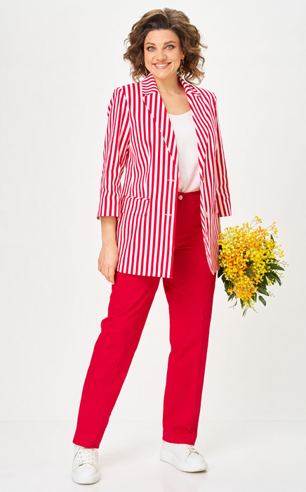 Костюм женский, 2-х предметный, состоит из жакета и брюк. Выполнен из хлопковой ткани. Жакет женский удлиненный, силуэт свободный, с центральной бортовой застежкой на пуговицы до линии перегиба лацкана. Спереди отрезной бочок и карман с клапаном. Спинка цельная. Рукав втачной. Воротник пиджачного типа. Перед жакета на подкладке. Длина по спинке 75 см, длина брюк по боковому 102 см.