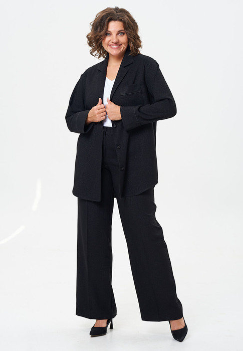 Комплект женский двойка, нарядный, из текстильной ткани с умеренным блеском. Блуза женская, свободного силуэта, воротник пиджачного типа, рукав втачной, по низу манжета. По переду блузку имеются нагрудные вытачки, по спинке кокетка и складка, низ фигурный. Длина по спинке 81 см, длина рукава 58 см. Брюки-палаццо, выполнены с карманами с отрезным бочком в боковом шве. Пояс притачной, застёжка на молнию. По задним половинкам обработаны вытачки. Длина по боковому шву 108 см.