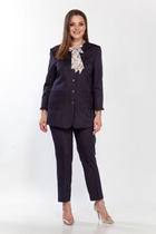 Костюм женский двухпредметный, состоит из кардигана и брюк. Кардиган свободного силуэта, двухцветный, выполнен из трикотажной ткани на подкладке. Рукав украшен Боа, застежка центрально-бортовая на две петли и пуговицы. Брюки классические с высокой посадкой, полуприлегающего силуэта, выполнены из костюмной ткани с добавлением эластана. Пояс без резинки с застежкой молнией на пуговицу. В боковых швах карманы с листочкой. Длина брюк 103 см.